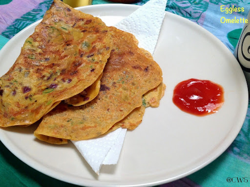 ପ୍ରଥମେ ଏକ ବଡ ପାତ୍ରରେ ଗୋଲ ଗୋଲ କଟାହୋଇଥିବା ଟୋମାଟ ଛଡା ଅନ୍ୟ ସମସ୍ତ ସାମଗ୍ରୀକୁ ମିଶାନ୍ତୁ । ଏହାକୁ ପାଣି ଦେଇ ଏକ ଆଣ ପ୍ରସ୍ତୁତ କରନ୍ତୁ । ଏହାକୁ ଘୋଡାଇ ୧୦ ମିନିଟ୍‌ ରଖିଦିଅନ୍ତୁ । ତାପରେ ଏହାକୁ ଗରମ ପ୍ୟାନରେ ଘିଅ ଲଗାଇ ଅମଲେଟ୍‌ ଆକାରରେ ପକାନ୍ତୁ । ଉପରେ ଗୋଲ ଗୋଲ କଟା ଟମାଟକୁ ରଖନ୍ତୁ । ଏହାପରେ ଅଳ୍ପ ତେଲ କିମ୍ବା ଘିଅ ଦେଇ ଏହାକୁ ଘୋଡାନ୍ତୁ । ୩ରୁ ୪ ମିନିଟ୍‌ ପରେ ଏହି ଘୋଡଣୀକୁ କାଢି ଦିଅନ୍ତୁ । ଏହାପରେ ଏହାକୁ ଦୁଇ ସାଇଡରୁ ଭାଜନ୍ତୁ । ଭାଜିହେବା ପରେ ପ୍ରସ୍ତୁତ ହୋଇଯିବ ଆପଣଙ୍କର ବିନା ଅଣ୍ଡାରେ ଅମ୍ଲେଟ୍‌ । ଏହାକୁ ଗରମ ଗରମ ସସ୍‌ ସହ ଖାଆନ୍ତୁ, ବେଶ ସ୍ୱାଦିଷ୍ଟ ଲାଗିଥାଏ ।